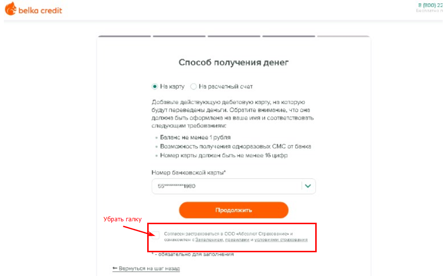 После заполнения анкеты требуется привязка банковской карты, путем блокировки на ней 1р. На этапе ввода данных банковской карты, необходимо в обязательном порядке убрать галочки с доп. услуг и страховки, в противном случае, отказаться от страховок будет сложнее и они будут навязаны с займом.