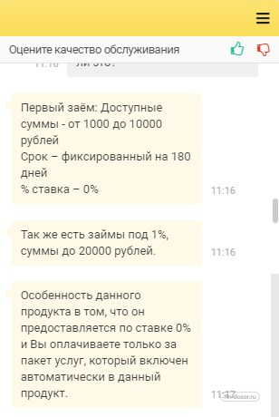- * - первый займ выдают под 0% в день. Однако, надо оплатить пакет услуг, который включен автоматически в данный продукт (Скрин из чата поддержки)