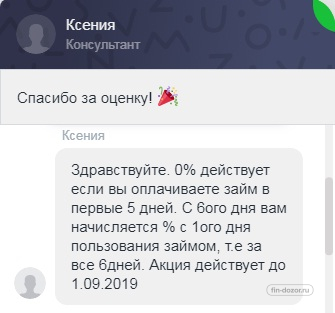 Для повторных клиентов при не возврате займа в первые 5 дней, с 6-го дня начисляется % за все дни, начиная с первого (Скрин из чата поддержки).