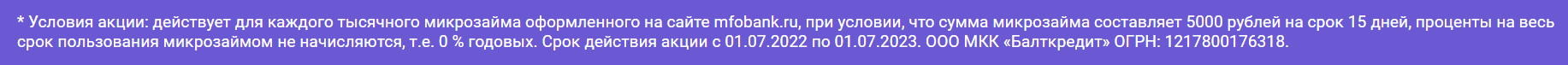 МФОБанк - бренд относительно новой и малоизвестной МКК «БалтКредит», зарегистрированной 24.02.2022г. Предлагает займы суммой от 1000 до 30000 рублей сроком от до 30 дней. Пользователю обещают круглосуточное и быстрое рассмотрение заявки. При оформлении есть галочки о страховке и юридических услугах.