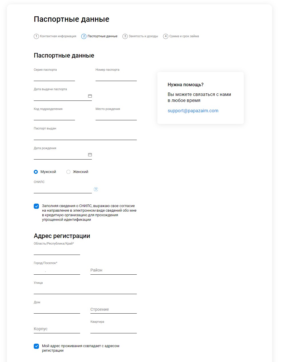 В Papazaim оформление происходит на сайте путем заполнения анкеты вручную или при помощи ГОСУСЛУГ. Компания работает только в онлайн формате, деньги можно получить не выходя из дома. Заем выдается на именную банковскую карту.