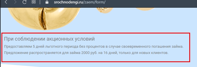 Предоставляет 5 дней льготного периода без процентов в случае своевременного погашения займа. Предложение распространяется для займа 2000 руб. на 16 дней, только для новых клиентов.